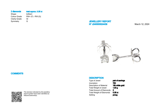 Orecchini in oro 18k con 0,35 CT di Diamanti F-G SI con certificazione HRD ANTWERP...