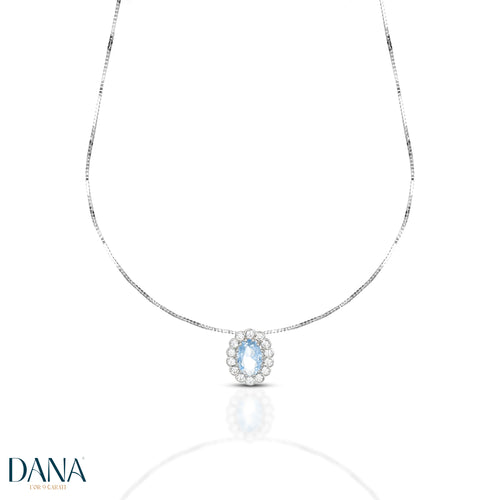 Realizzata in oro 9 carati, presenta un pendente ovale impreziosito da una pietra naturale non preziosa nei toni del bianco, rosso, verde, blu o azzurro, contornata da zirconi bianchi di alta qualità che ne amplificano la luminosità.