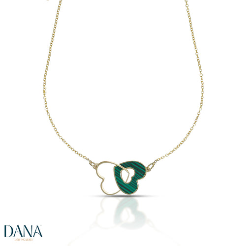 This 9k yellow gold necklace by DANA features a 42cm chain with a 3cm extension. The pendant features an intertwined heart with malachite.