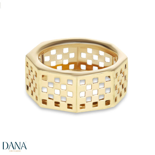 Un équilibre parfait entre élégance et modernité : cette bague Dana est confectionnée en or jaune 9 carats et ornée d’une finition ajourée raffinée. Un accessoire polyvalent et élégant, idéal au quotidien comme pour les grandes occasions.