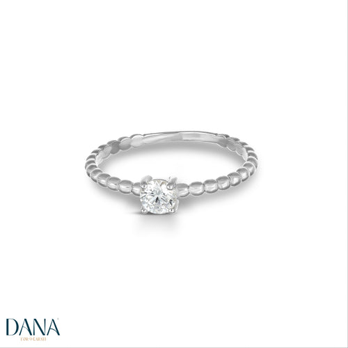 Bague solitaire en or blanc 9 carats signée DANA, avec une finition perlée : délicate et élégante, elle se distingue des solitaires classiques et constitue le compromis idéal pour sublimer votre style.
