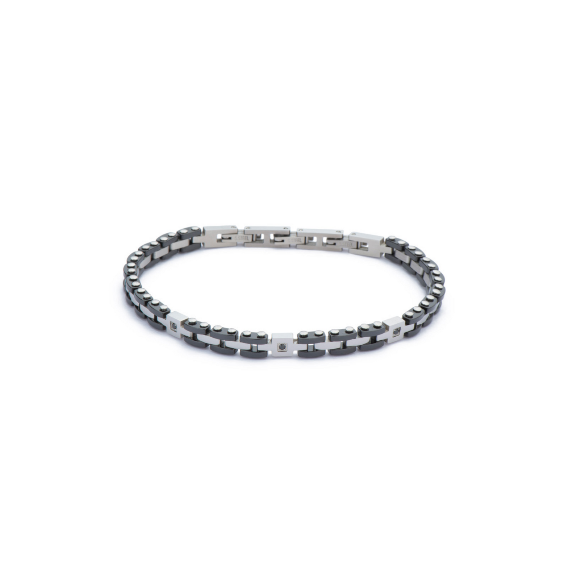 Catena a maglia ingranaggio acciaio e nero intervallata da elementi carrè e cristalli black jet