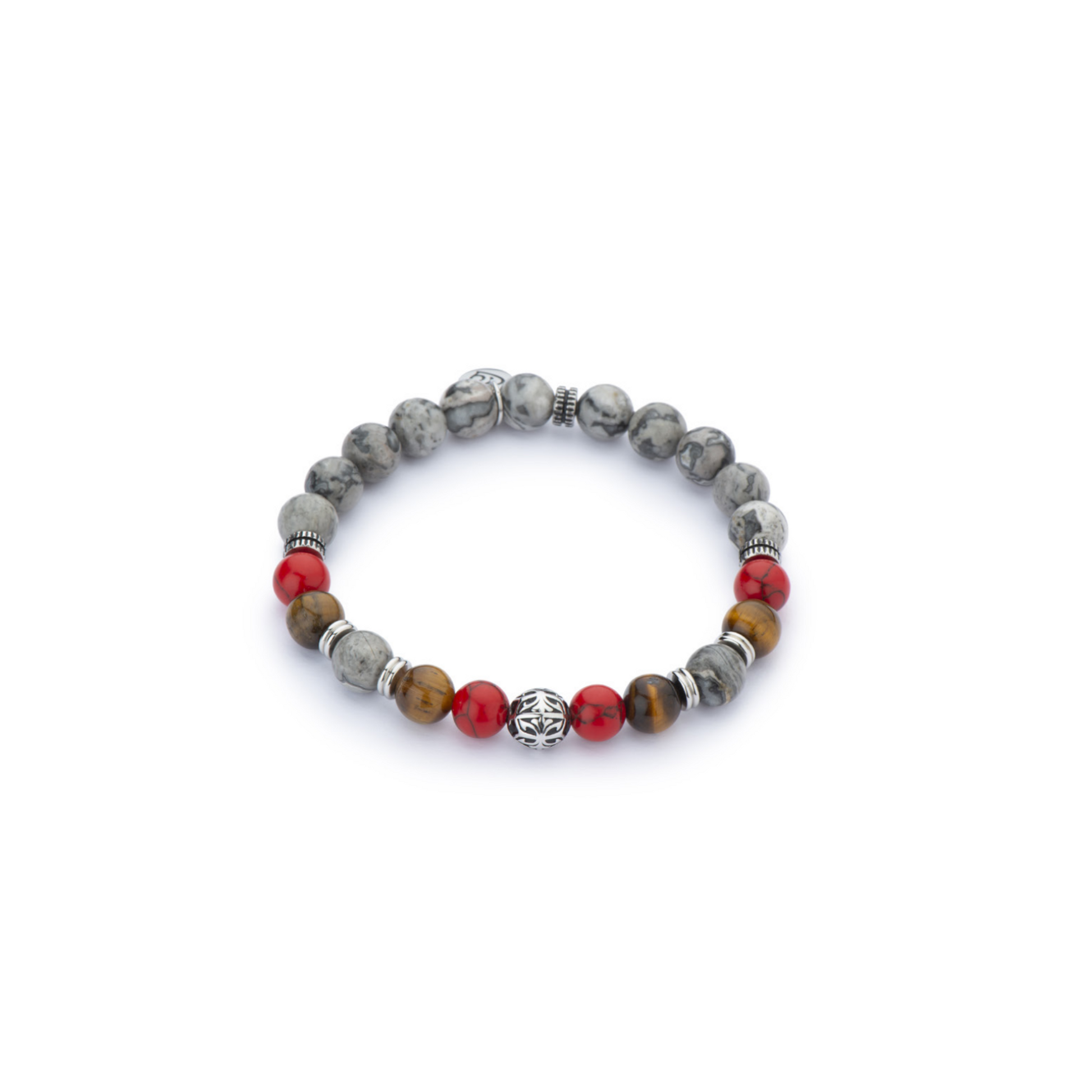 Elemento centrale sferico con emblema in acciaio e sfere in pietre dure rosso, tiger eye e sodalite/diaspro grigio