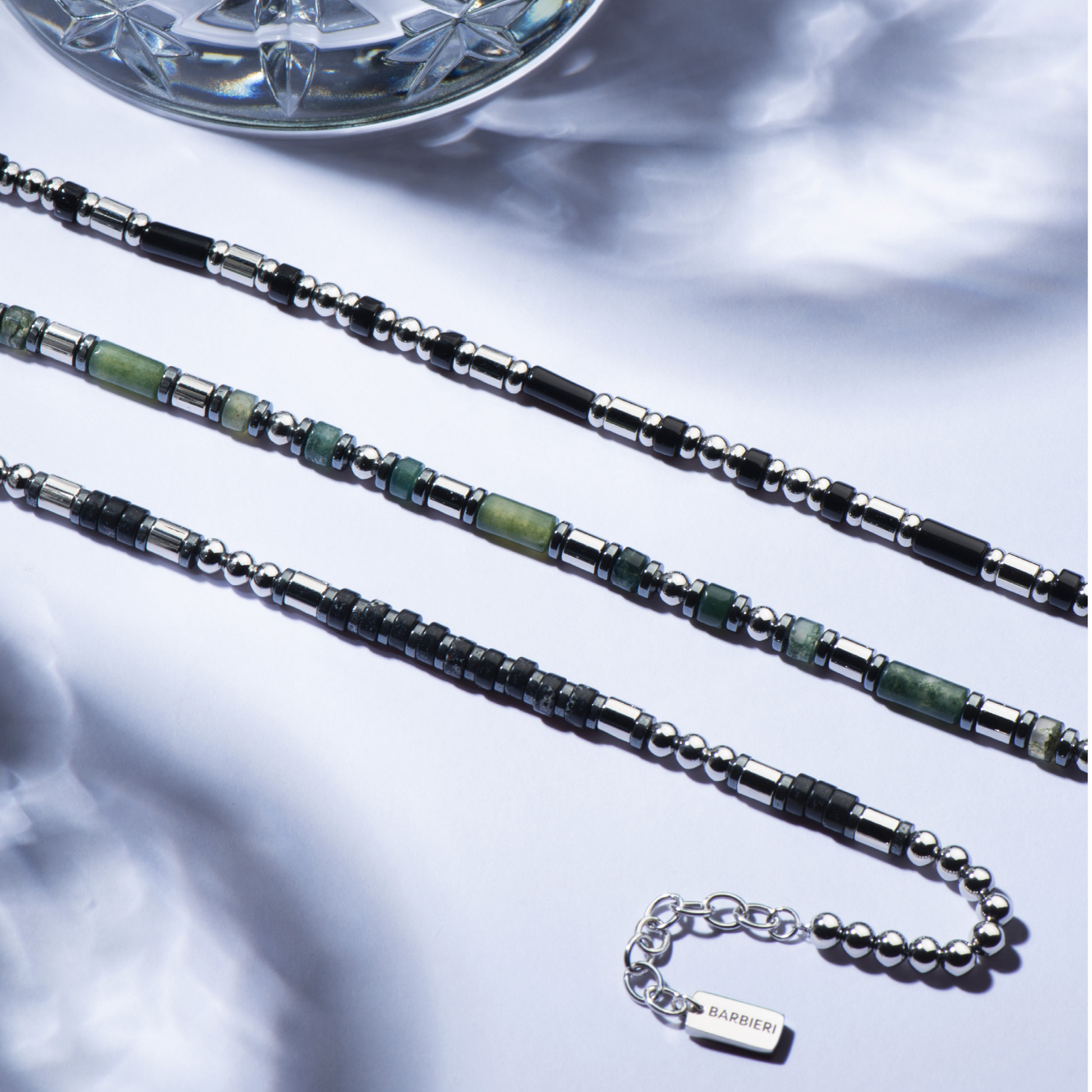 Sferette e cilindri in acciaio alternati a dischetti in pietra dura diaspro blu/diaspro nero