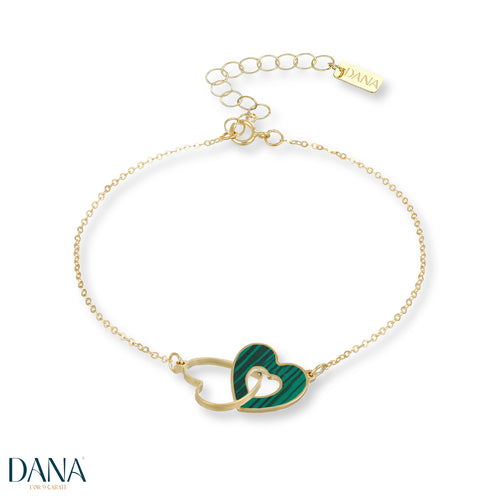 Questo bracciale in oro giallo 9 carati firmata DANA e composto da una catena lunga 17 centimetri con estensione di 2 cm. centrale con cuori intrecciati con malachite.