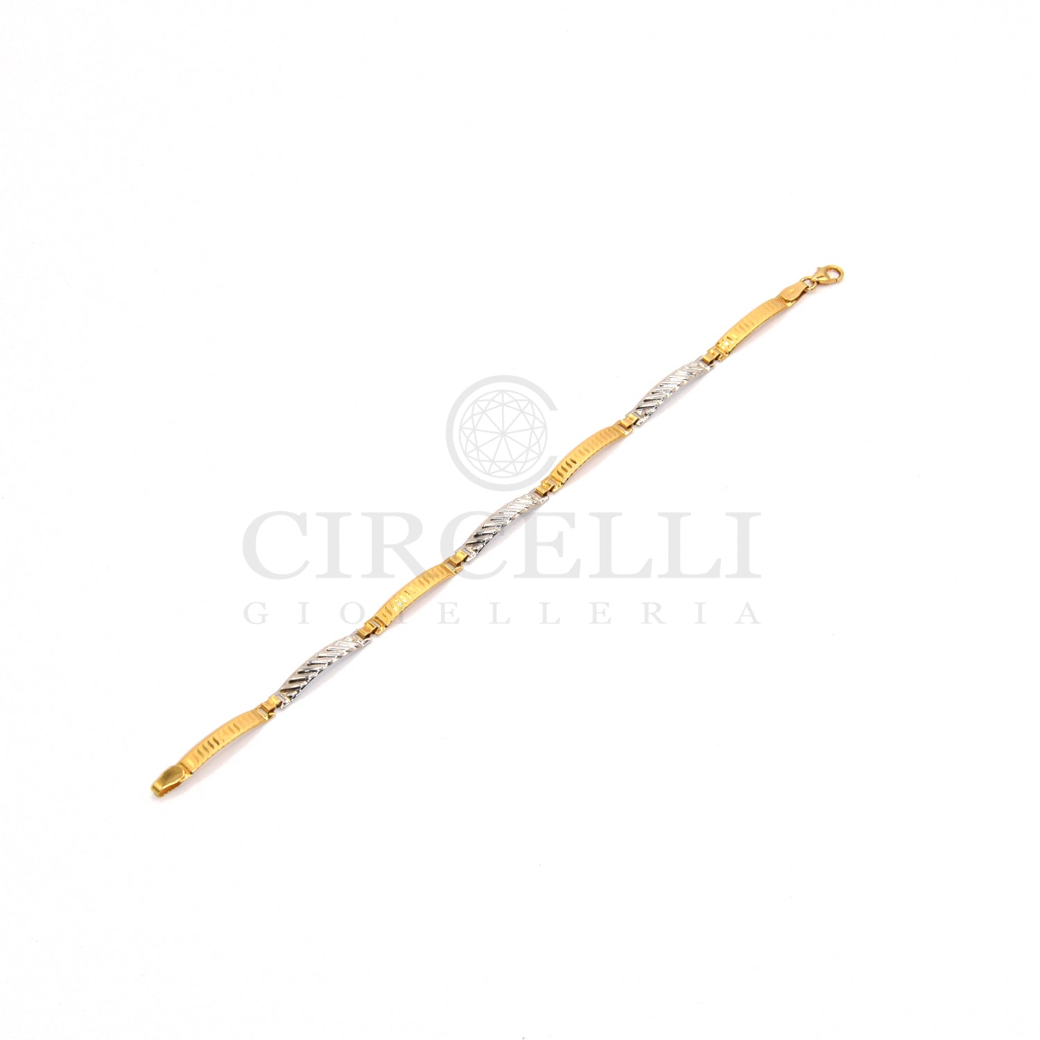 Bracciale piastre con fantasia incisa laser, oro bianco e oro giallo, 18 carati