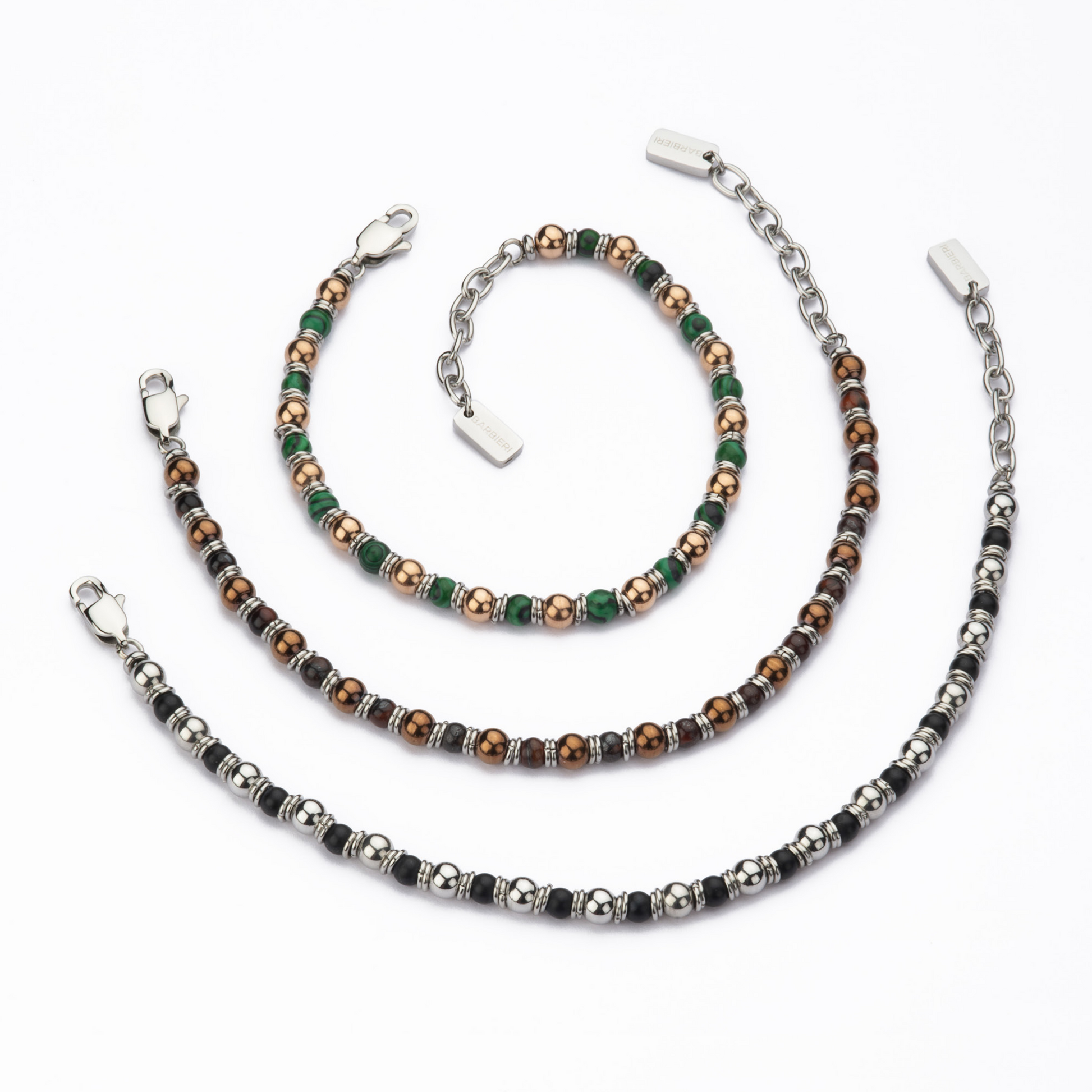 Sfere ed anelli da 5 mm in acciaio alternati da pietre dure tiger eye/Malachite/Onice