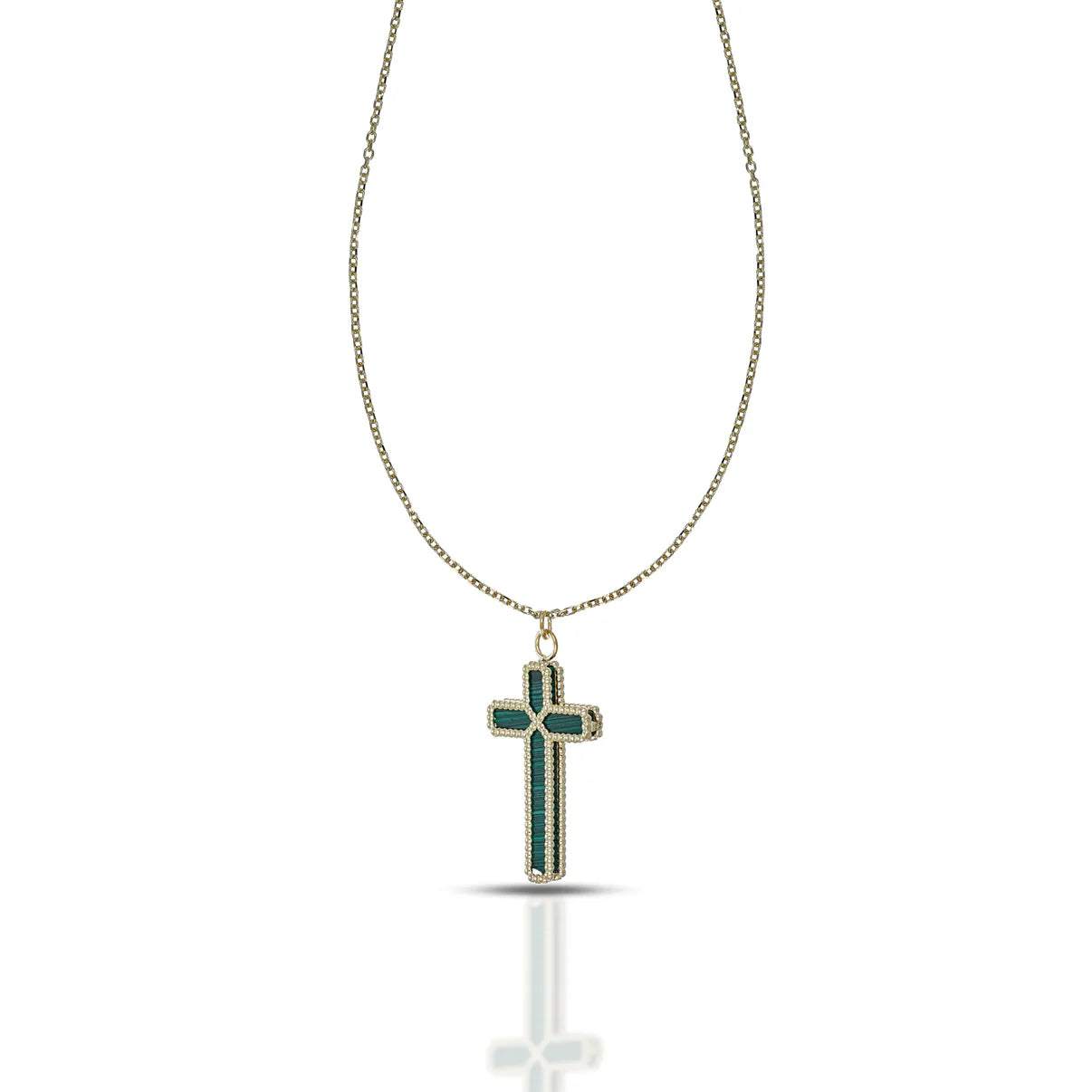 La croce, elemento centrale del design, è reinterpretata in modo minimalista e raffinato, mantenendo tutta la sua forza spirituale e il suo valore profondo. Con linee pulite e sottili, il pezzo si distingue per la sua capacità di risplendere con eleganza, riflettendo la luce che emana da dentro. Grazie alla doppia vestibilità la si può indossare dal lato in tutto oro diamantato per un look più classico e minimal, o dal lato con onice, malachite o madreperla per uno stile più glamour e di tendenza.