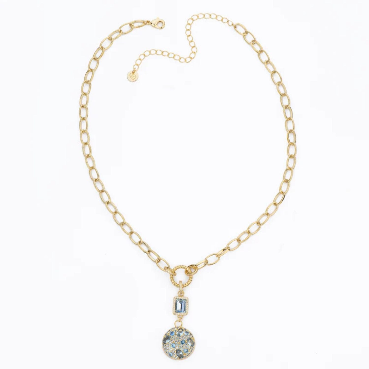 Collana con catena in brass dorato e pendente con cristallo indicolite e tondo in pavè di zirconi sapphire e aquamarine.