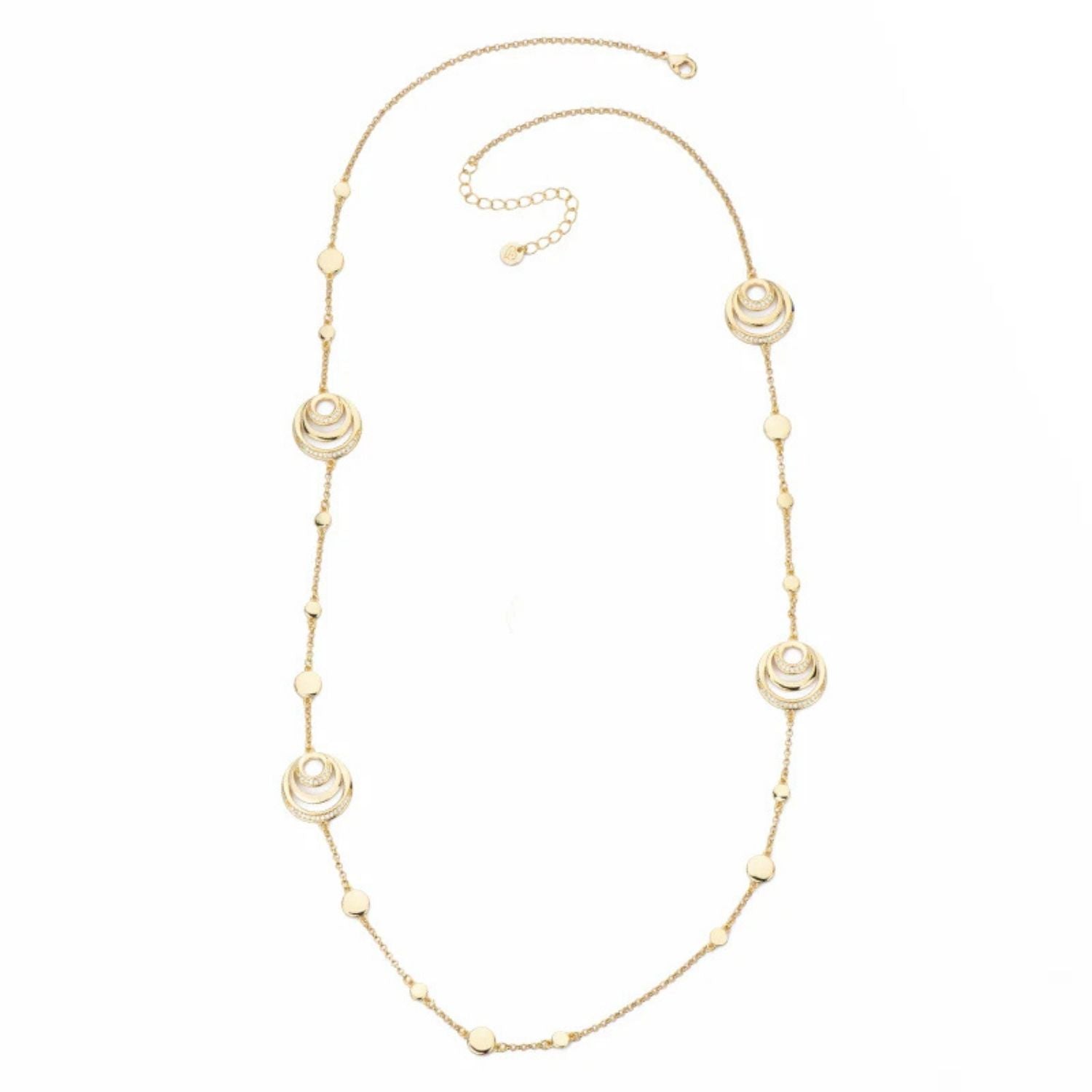 Questa collana con catenina in brass presenta pastigliette lisce alternate a cerchi sovrapposti impreziositi da pavé di zirconi clear: per un gioco di luce elegante e moderno.